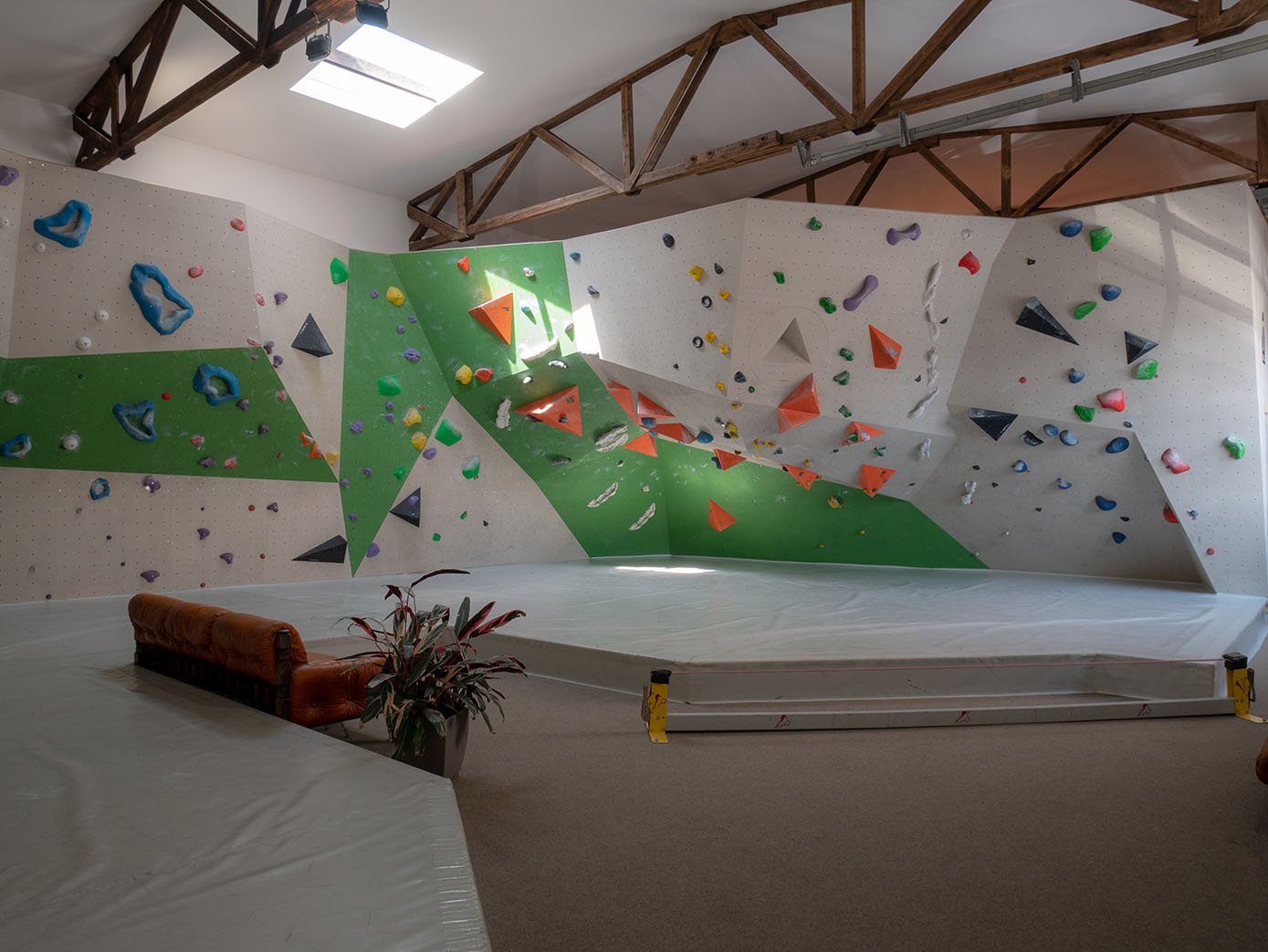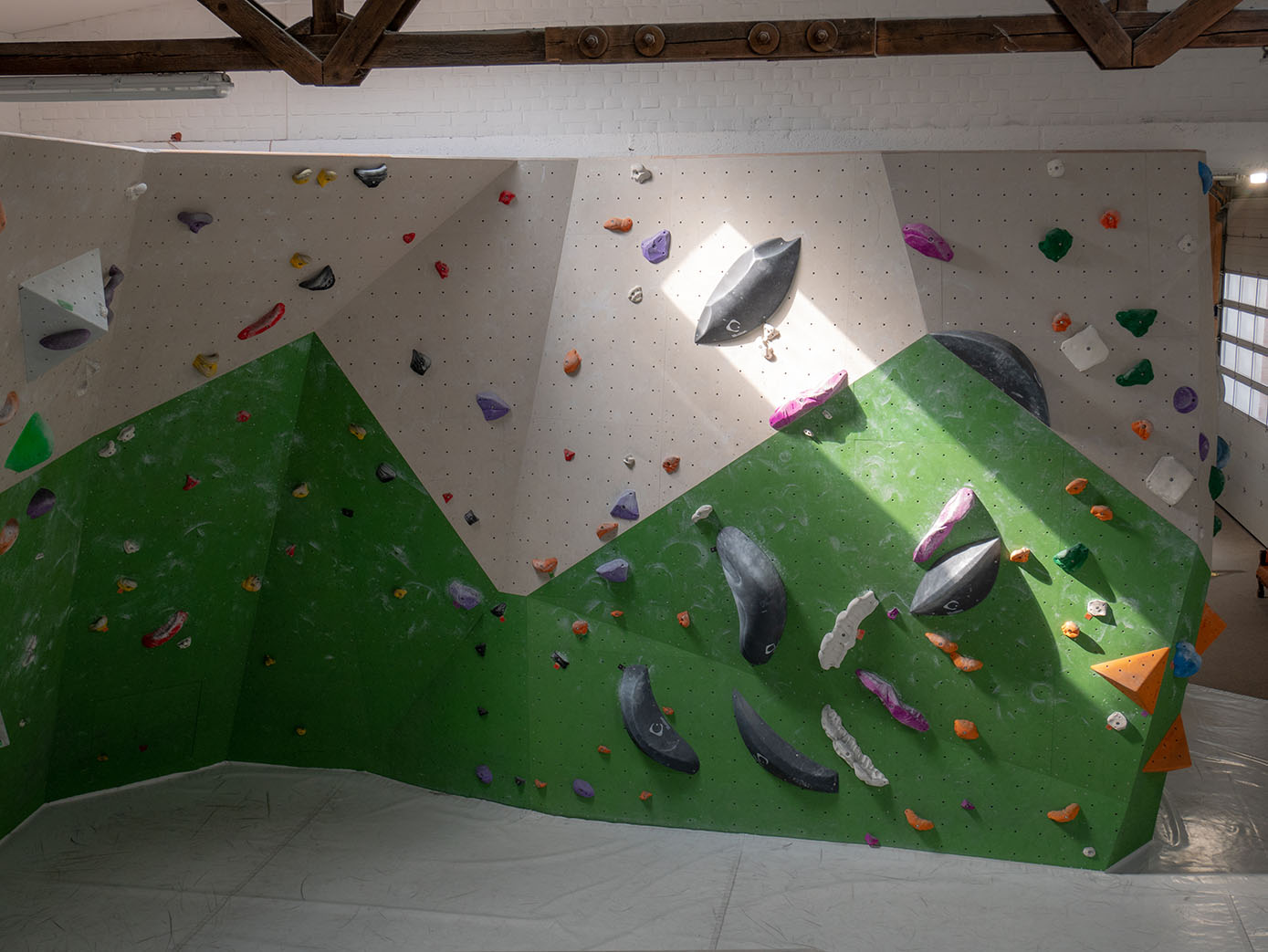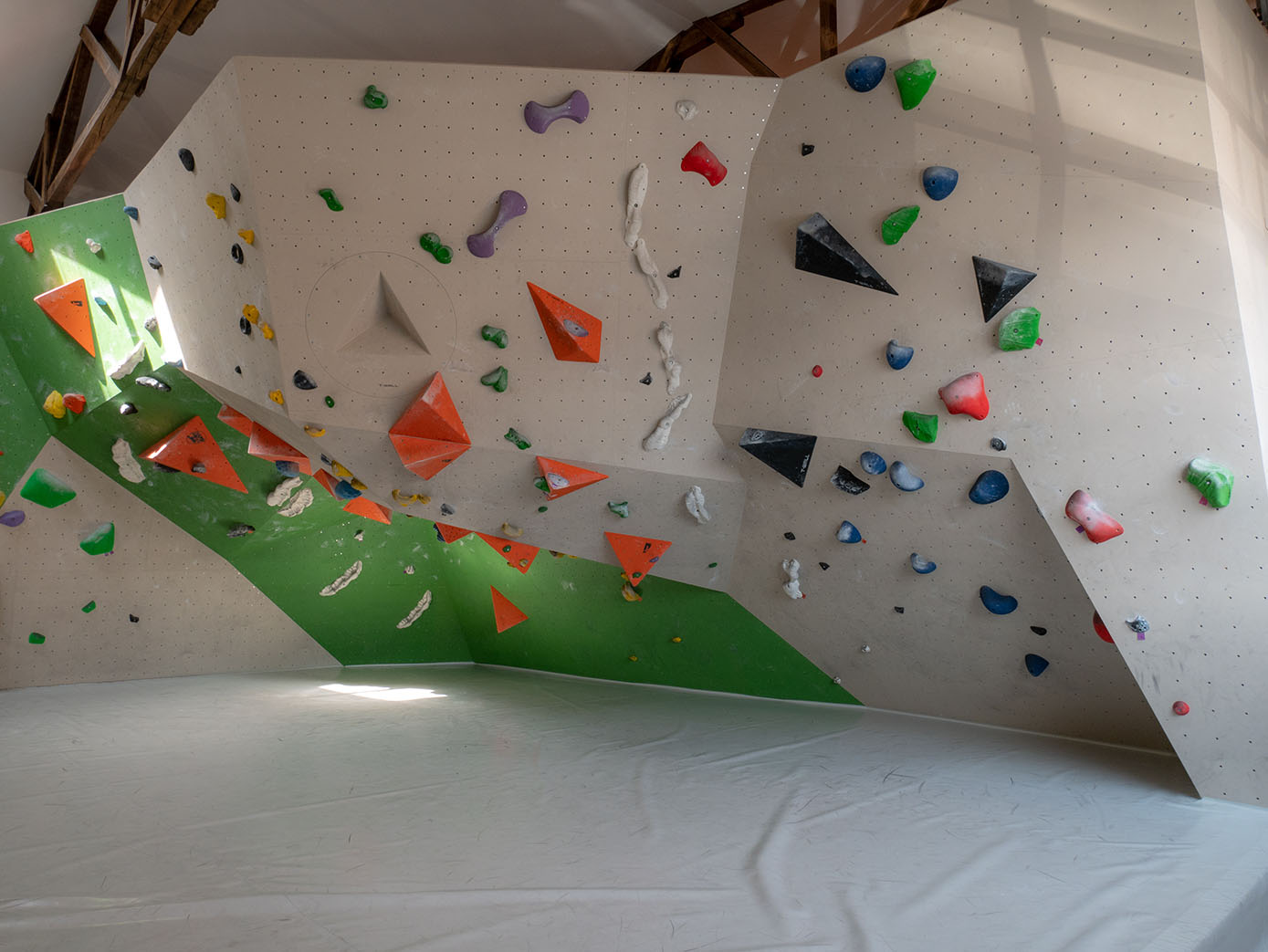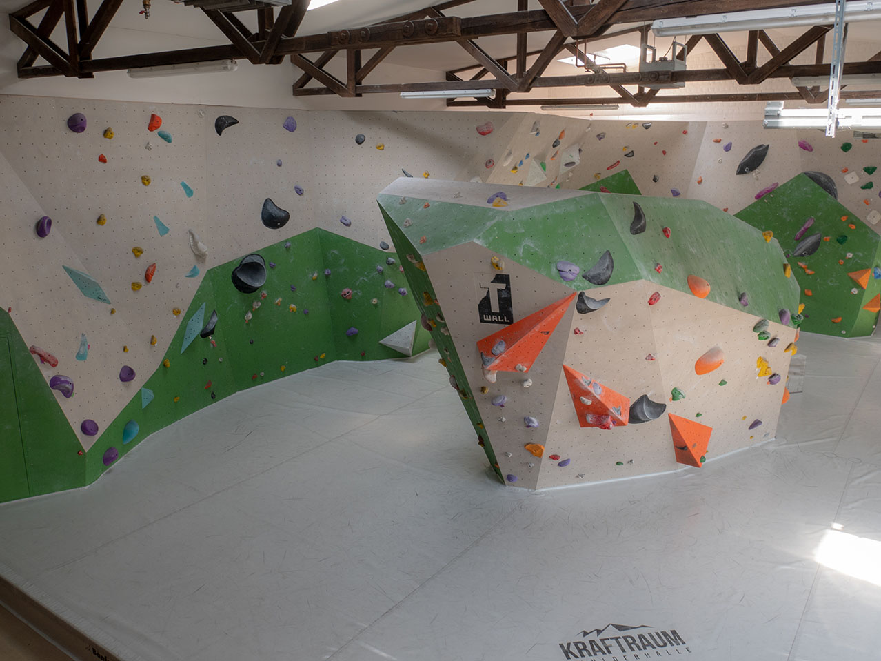 Der Kraftraum bietet auf einer Grundfläche von 800 Quadratmetern etwa 500 Quadratmeter Kletterfläche. Die Boulder sind in verschiedene Schwierigkeitsgrade unterteilt, die ihr an unterschiedlich farbigen Startschildern erkennen könnt.