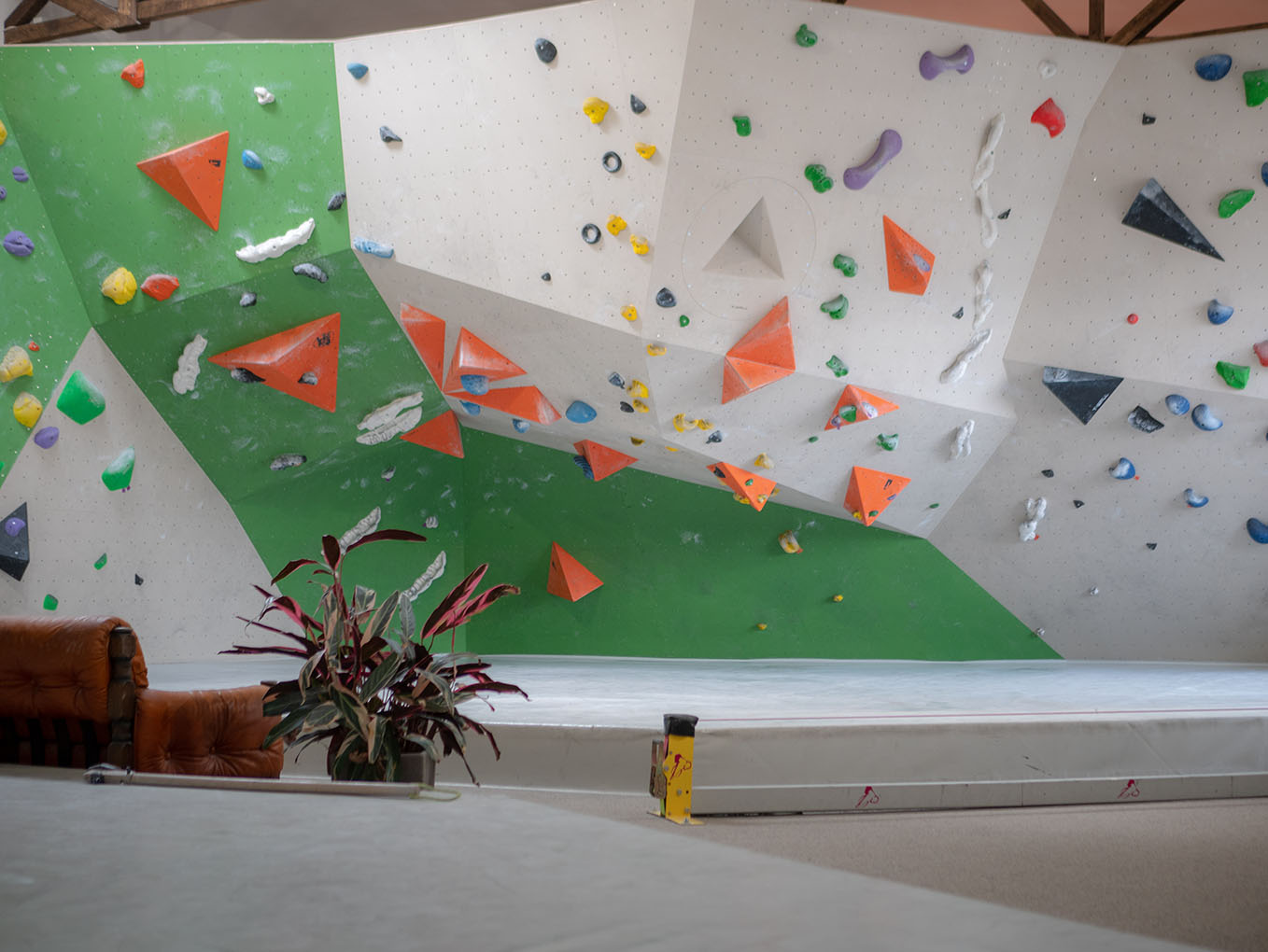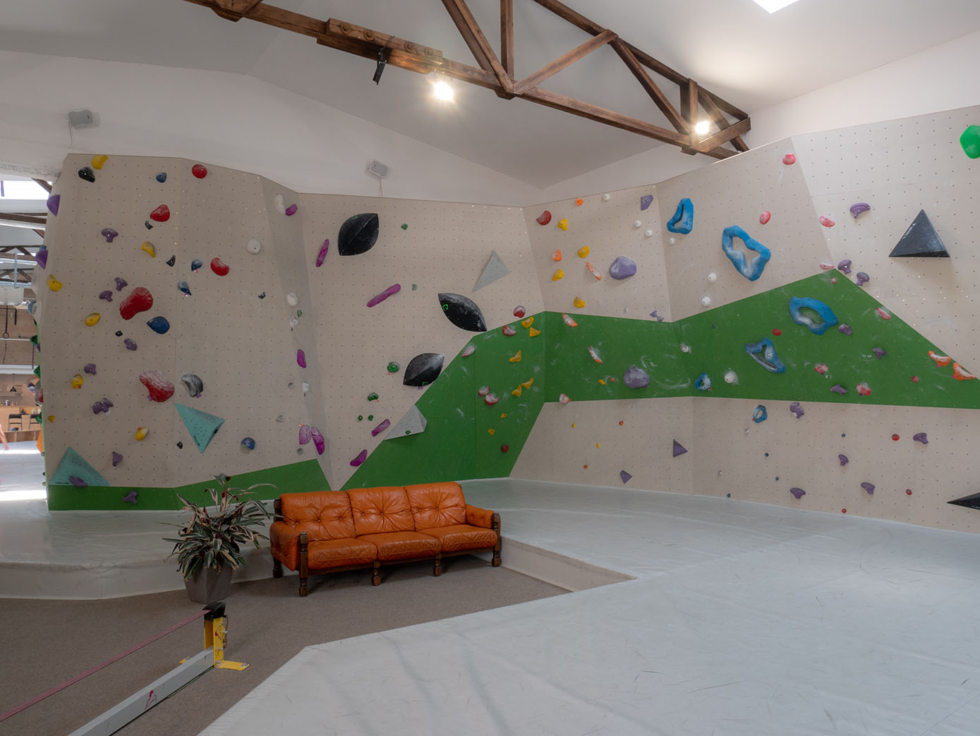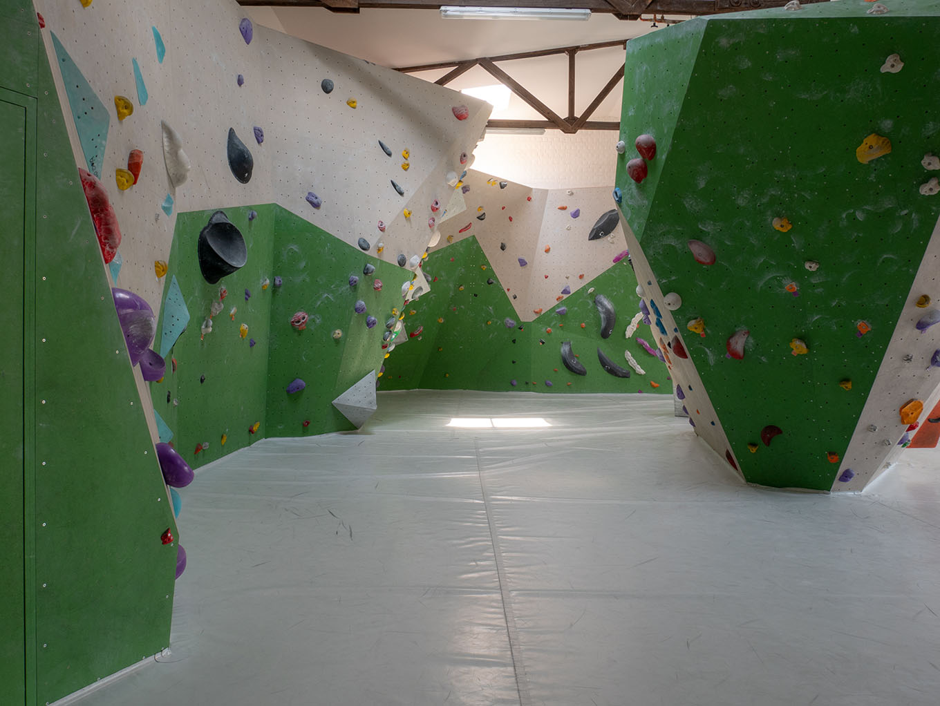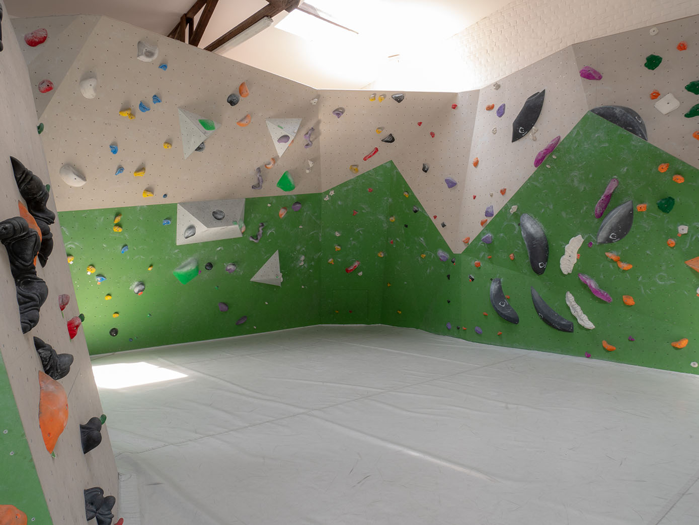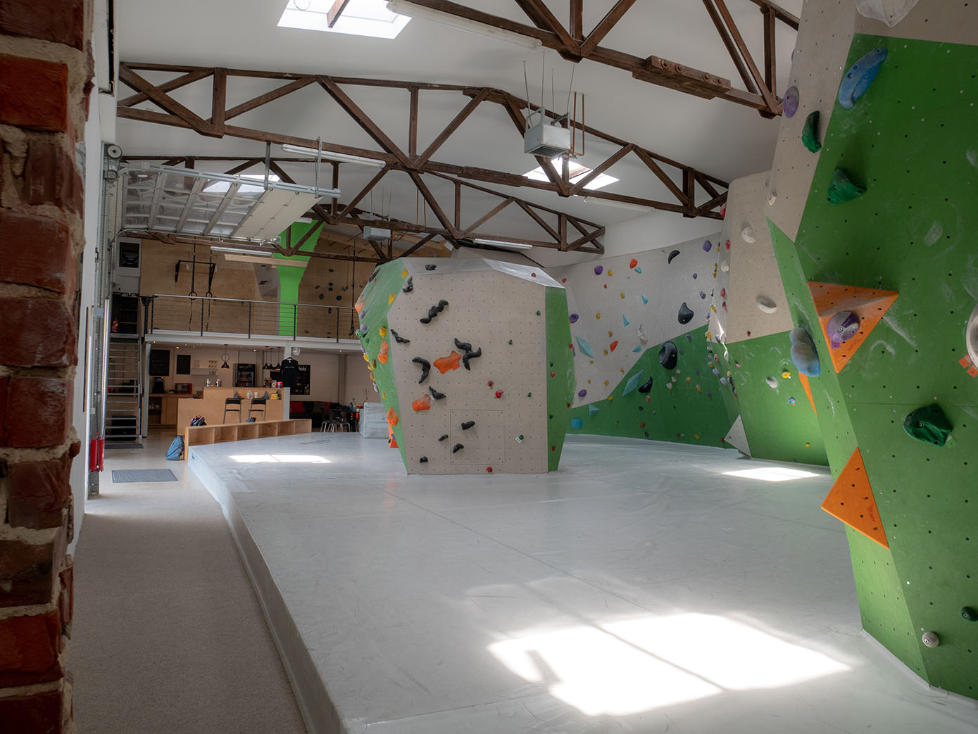 Der Kraftraum bietet auf einer Grundfläche von 800 Quadratmetern etwa 500 Quadratmeter Kletterfläche. Die Boulder sind in verschiedene Schwierigkeitsgrade unterteilt, die ihr an unterschiedlich farbigen Startschildern erkennen könnt.